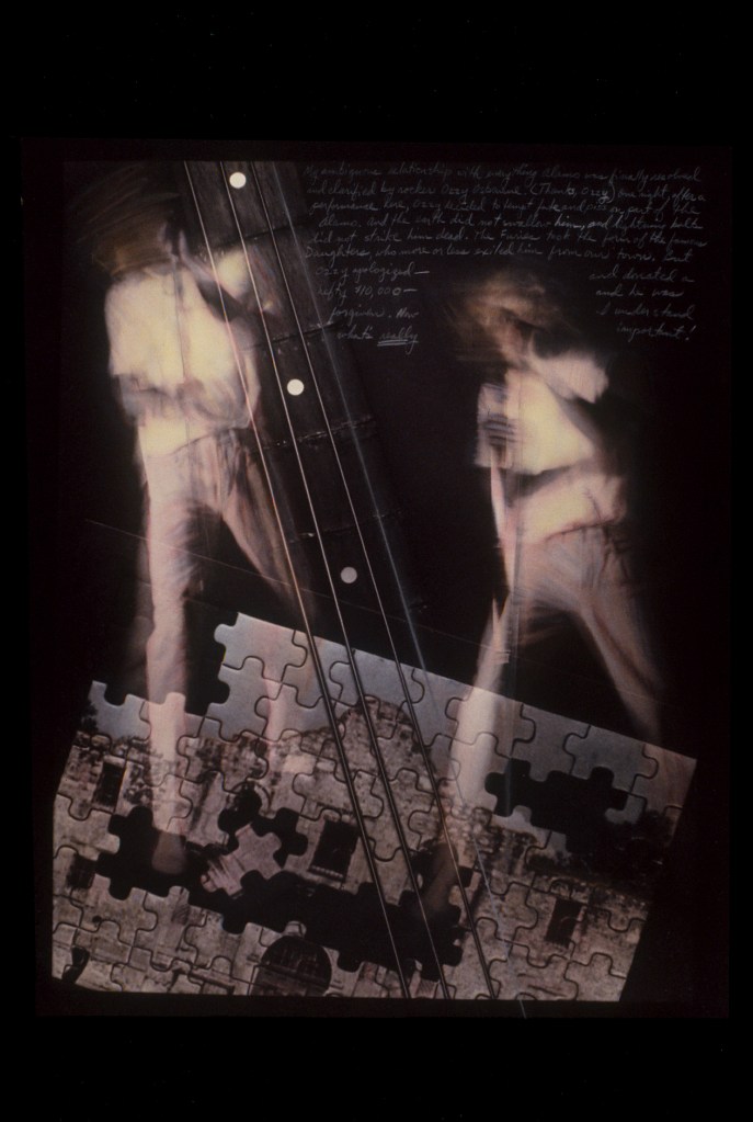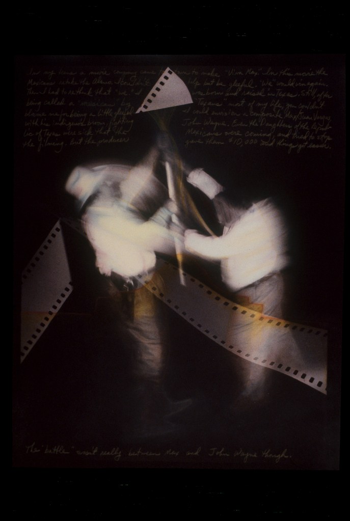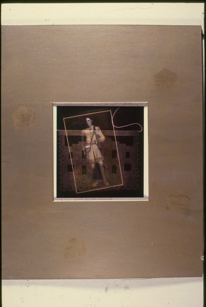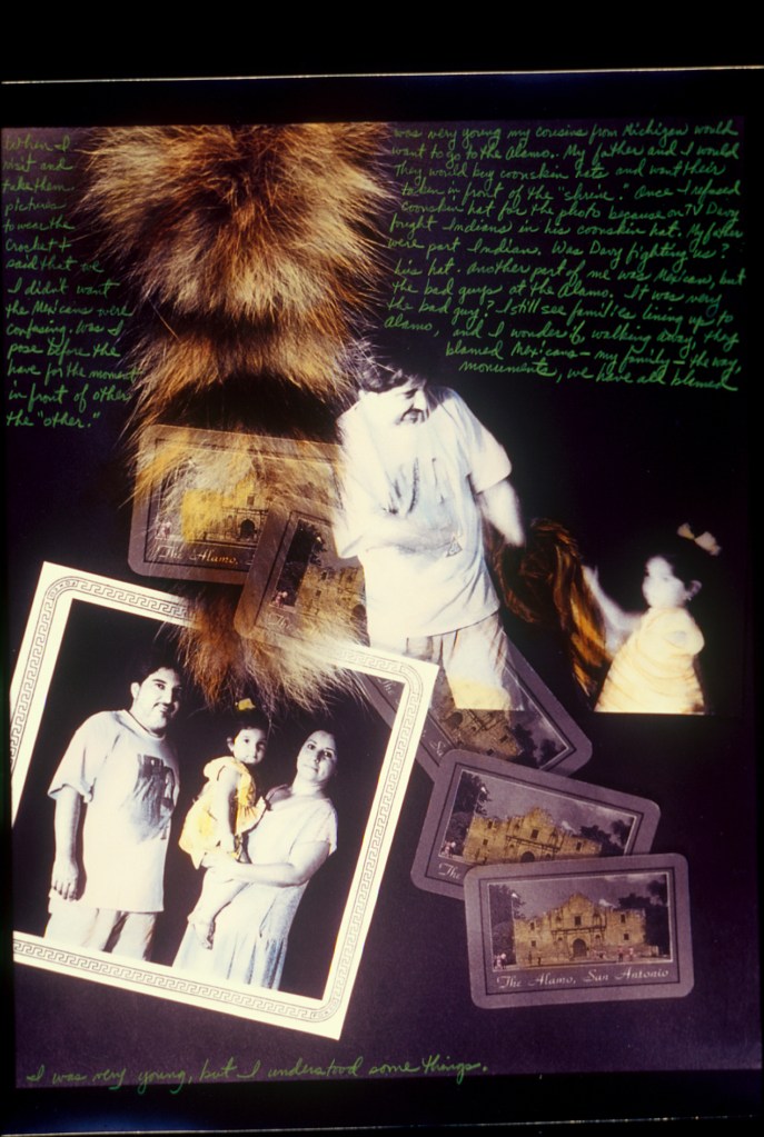 The Mexican Museum in San Francisco commissioned several Chicano photographers, myself included, to consider the American West from the Latino perspective. Since I live in San Antonio, I knew I had to confront my relationship with the Alamo. I hit on the idea of altarpieces, since the Alamo is considered a “shrine.” I created diptychs. The first panel depicts my reality; the second, in a silver matte, enshrines what the power structure values. To make sure the images were understood, I added text, which reads…