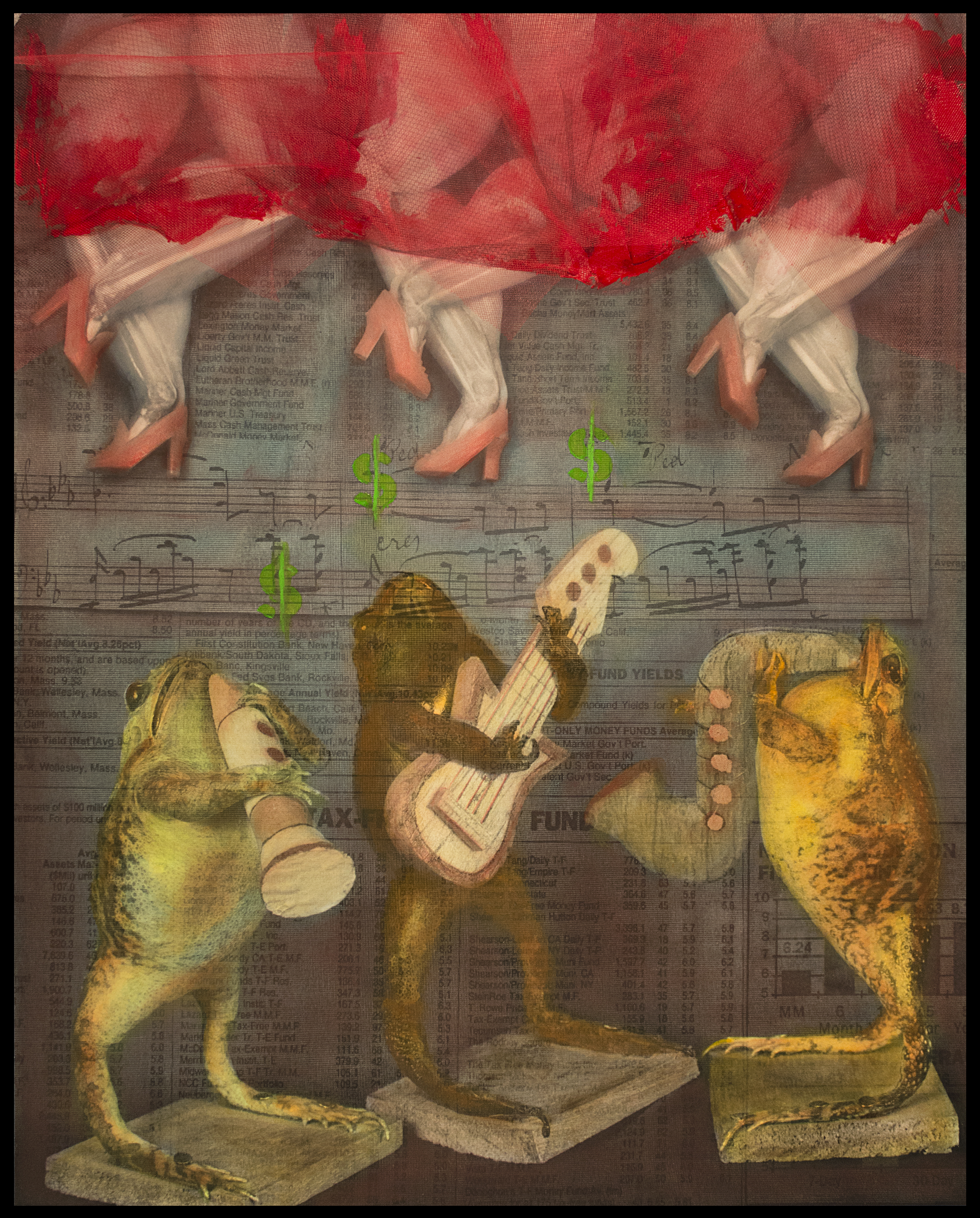 My dark sense of humor created frog’s legs dancers, kicking up their heels to a money tune. Kindly notice, though, that the musicians playing the song have their hands nailed to their instruments. Even those who call the tune pay a price.